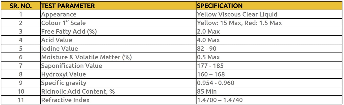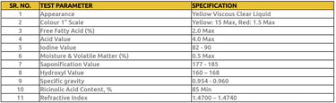 It is a pale yellow, viscous, oily liquid insoluble in water. It contains more than 87% of a unique hydroxy fatty acid viz. Ricinoleic acid. It is also knows as Industrial grade castor oil. It is used for many industrial applications. It is used extensively in the manufacturing of textile chemicals and as a wetting agent for inks, coatings, solvents and adhesives.